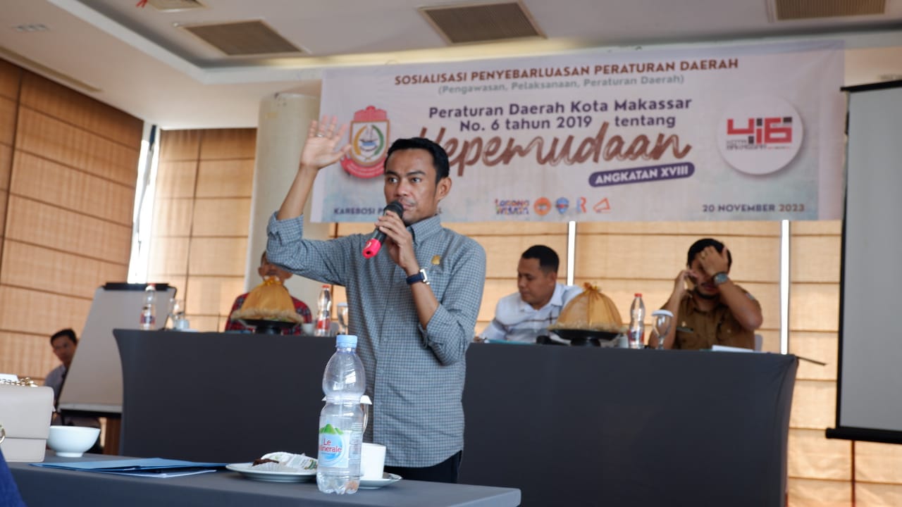 Makassar,Inisulsel.com – Anggota DPRD Kota Makassar, Sahruddin Said menggelar sosialisasi angkatan 18, peraturan daerah (Perda) nomor 6 tahun 2019 tentang Kepemudaan di Hotel Karebosi Primer, Makassar, Senin (20/11/2023).