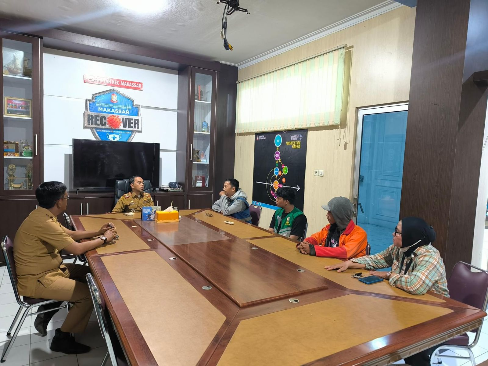 Plt. Camat Makassar, Harun Rani, didampingi Plt. Kasi Kebersihan Akhmad Rijal, bersama Pengawas Taman Ta’coz dan petugas taman median tengah, menggelar rapat koordinasi guna membahas penataan dan mengevaluasi kinerja para petugas taman median tengah di wilayah Kecamatan Makassar, di ruang kerja Camat, Selasa (28/11/2023).