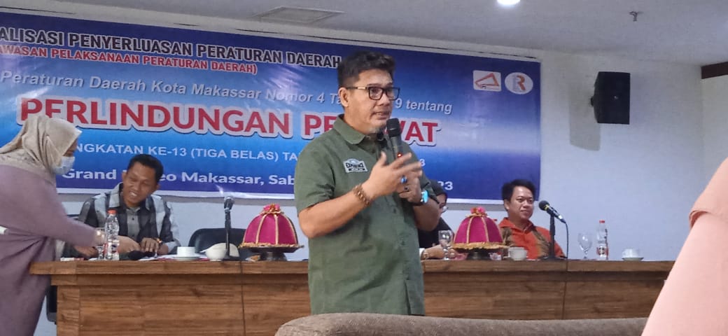 Makassar,Inisulsel.com – Wakil Ketua DPRD Kota Makassar Adi Rasyid Ali kembali menemui konstituennya dalam rangka sosialisasi penyebarluasan produk hukum daerah Kota Makassar angkatan 13, di Hotel Grand Maleo, Sabtu (23/12/2023). Sosialisasi kali mengangkat tema ”Perda Nomor 4 Tahun 2019 Tentang Perlindungan Perawat”.