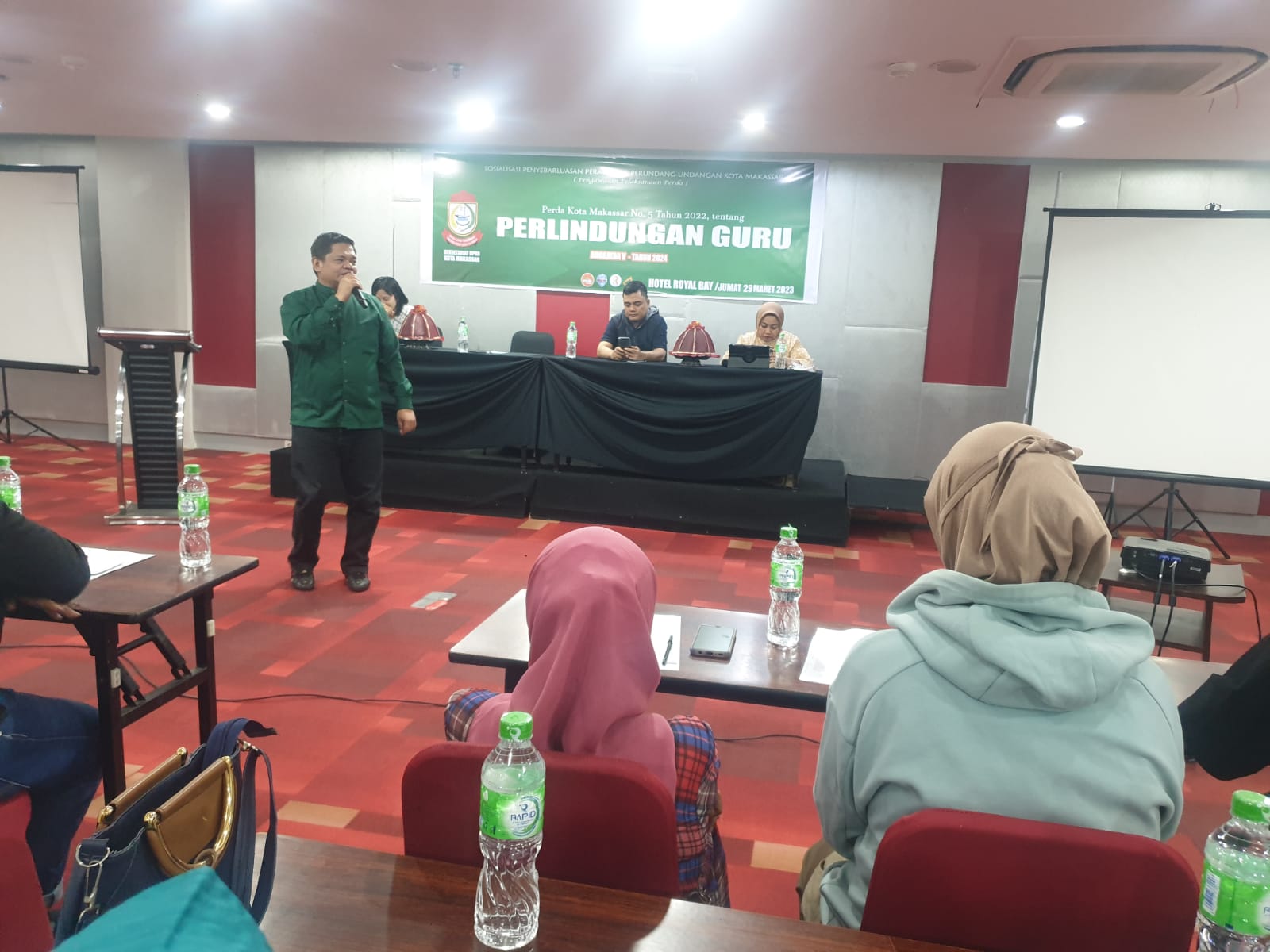 Makassar,Inisulsel.com – Anggota DPRD Kota MakassarFasruddin Rusli menggelar Sosialisasi angkatan 5, Peraturan daerah nomor 5 tahun 2022 tentang Perlindungan Guru di Hotel Royal Bay, Jumat (29/03/2024).
