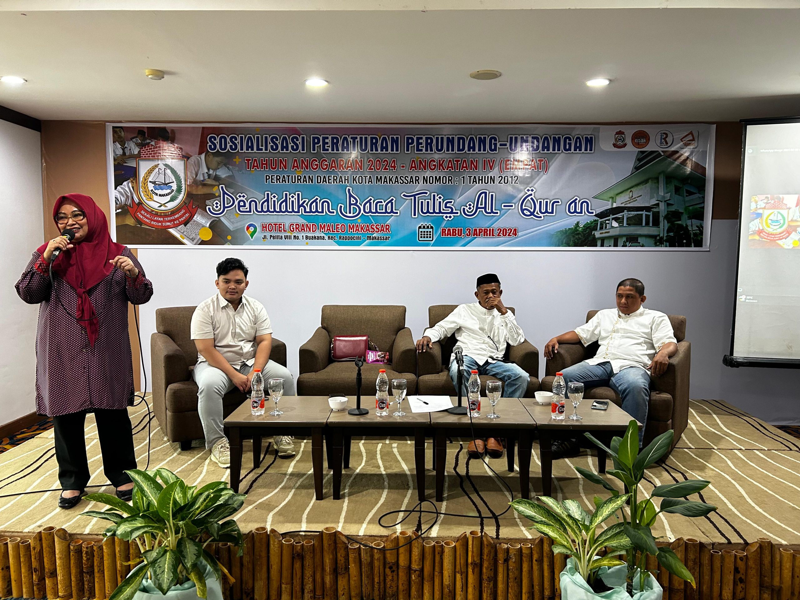 Anggota DPRD Kota Makassar Hj.  Andi Astiah menggelar Sosialisasi Penyebarluasan Peraturan Daerah angkatan 4 dengan membahas Perda Nomor 1 Tahun 2012 Tentang Pendidikan Baca Tulis Al-Quran Angkatan Keenam, di Hotel Grand Maleo, Rabu (03/04/2024).