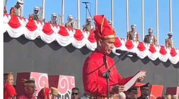 “Proklamasi. Kami bangsa Indonesia dengan ini menyatakan Kemerdekaan Indonesia. Hal-hal yang mengenai pemindahan kekuasaan dan lain-lain diselenggarakan dengan cara seksama dan dalam tempo yang sesingkat-singkatnya. Jakarta, 17 Agustus 1945 atas nama bangsa Indonesia. Soekarno-Hatta,” ucap Rudianto Lallo.