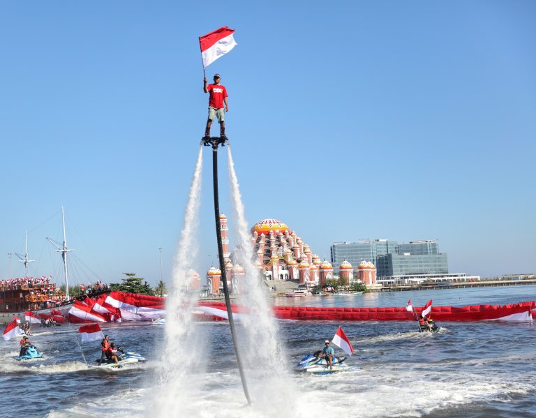 Tak ketinggalan, atraksi jetski dan flyboard yang membawa bendera merah putih berkibar di udara menambah semarak perayaan.