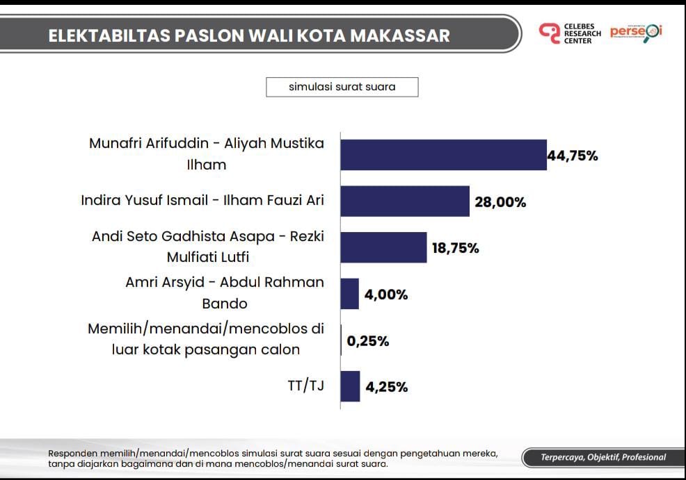 Hasilnya, Appi-Aliyah paling banyak dipilih responden yakni 44,75%. Kemudian disusul paslon nomor urut 3, Indira-Ilham (INIMI) 28,00%.