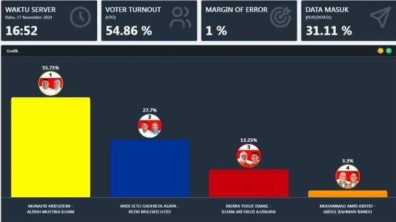 Di posisi kedua, pasangan SEHATI meraih 27,7 persen suara, disusul oleh INIMI dengan 13,25 persen, sementara pasangan AMAN berada di posisi terakhir dengan 3,3 persen suara. Angka ini menunjukkan dominasi pasangan MULIA dalam tahap awal penghitungan.