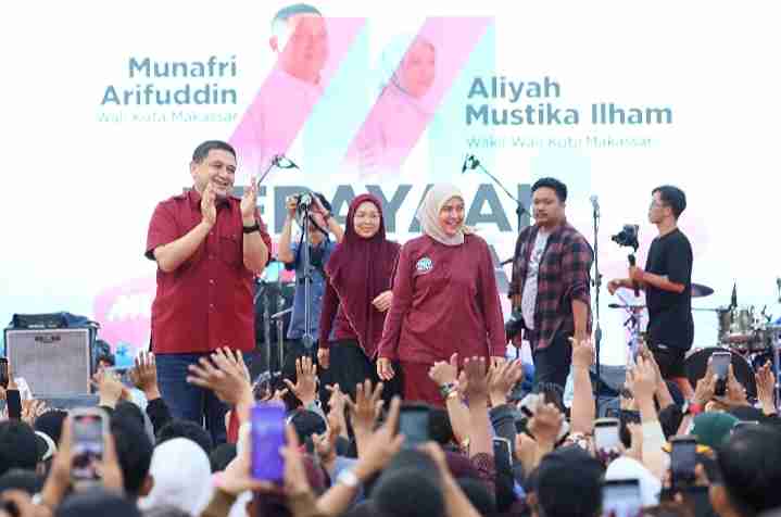 Makassar, Insulsel.com— Munafri Arifuddin dan Aliyah Mustika Ilham, pasangan Wali Kota dan Wakil Wali Kota Makassar terpilih yang dikenal dengan sebutan MULIA, merayakan kemenangan bersama tim pemenangan dan masyarakat Kota Makassar di Pantai Bosowa, Jalan Metro Tanjung Bunga, Minggu (27/4/2025).