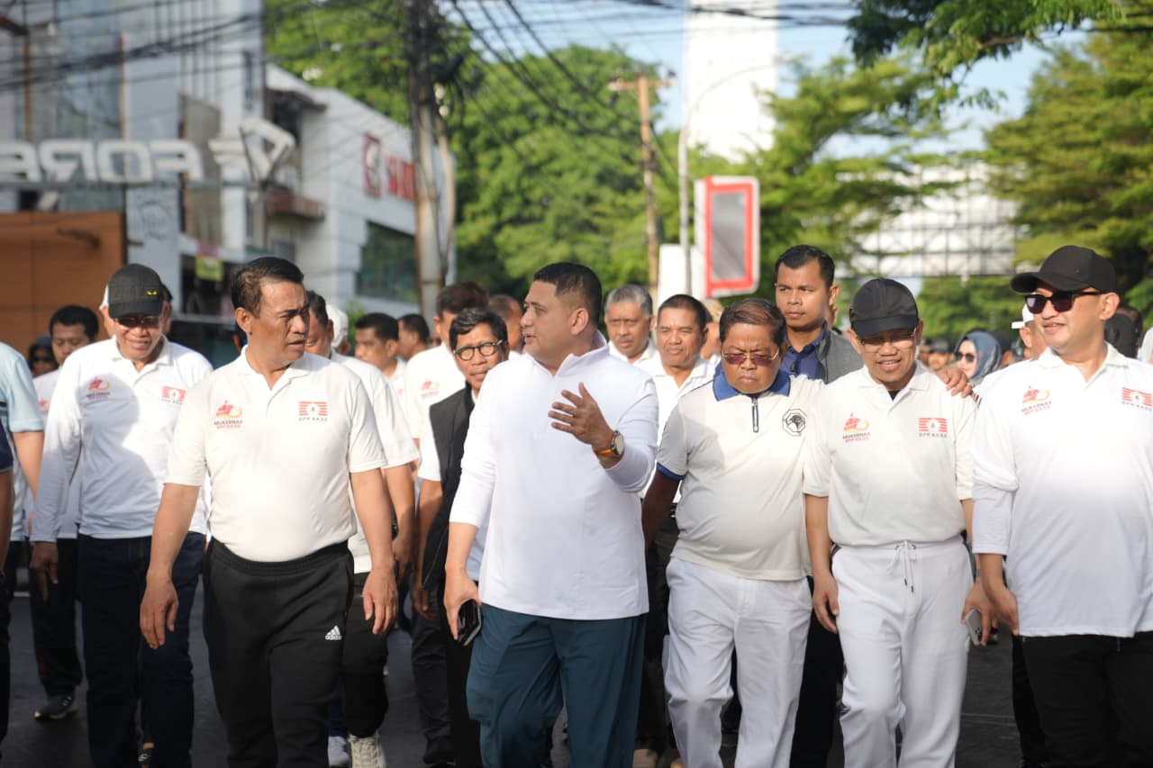 Munafri Arifuddin, tampil santai menyapa warga dalam kegiatan Jalan Santai KKSS. Tak sendiri, ia turut didampingi Menteri Pertanian RI, Andi Amran Sulaiman, serta tokoh nasional Idrus Marham, yang menambah antusiasme peserta di sepanjang rute.