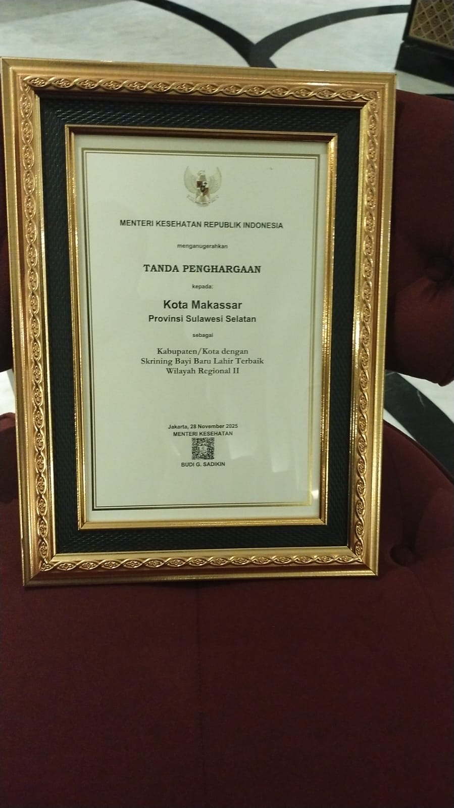 Penghargaan dari Kementerian Kesehatan diterima langsung oleh Kepala Dinas Kesehatan Kota Makassar, dr. Nursaidah Sirajuddin, mewakili Wali Kota, Munafri Arifuddin.