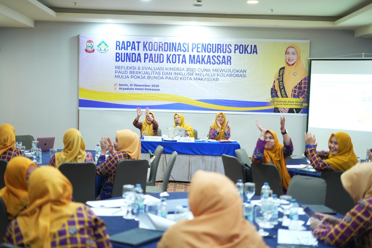 MAKASSAR,INISULSEL.COM, — Pokja Bunda PAUD Kota Makassar menggelar Rapat Koordinasi Pengurus sebagai momentum refleksi dan evaluasi kinerja tahun 2025. Kegiatan ini berlangsung di Hotel Aryaduta Makassar, Senin (15/12/2025), dengan mengusung tema “Refleksi dan Evaluasi Kinerja 2025 Guna Mewujudkan PAUD Berkualitas dan Inklusif melalui Kolaborasi Mulia Pokja Bunda PAUD Kota Makassar.”