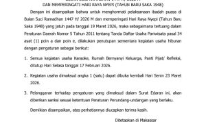 Surat edaran yang ditetapkan di Makassar pada 13 Februari 2026 tersebut ditujukan kepada seluruh pengelola atau pengusaha karaoke, rumah bernyanyi keluarga, serta panti pijat atau refleksi yang beroperasi di wilayah Kota Makassar.