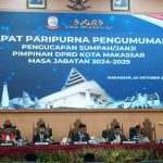 Makassar,Inisulsel.com – DPRD Kota Makassar menggelar rapat paripurna pengucapan sumpah dan janji terhadap 4 pimpinan definitif periode 2024-2029. Pengambilan sumpah pimpinan tetap